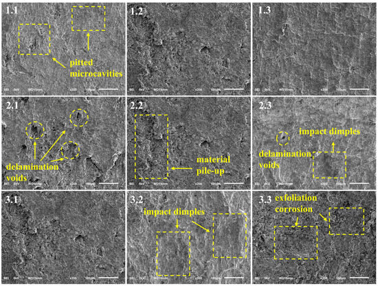 The microstructural characteristics and surface features of the specimens reflect the impact strengthening mechanism of ultra-high-pressure water jet impingement. Figure 5 and Figure 6 (Specimen number 1.1–3.3 shown in Table 2) present SEM images of the grade-A marine steel at 200× and 500× magnifications. As observed, Specimen 1.1 (130 MPa) exhibited pitted microcavities with poor surface integrity and incomplete rust removal. In Specimen 1.2 (150 MPa), delamination voids significantly increased in density, depth, and size, accompanied by localized material pile-up and a sharp rise in surface roughness, indicating effective rust layer stripping at moderate pressure. Conversely, Specimen 1.3 (170 MPa) showed reduced delamination voids, increased pitted microcavities, and lower roughness. From the standoff distance perspective, Specimen 2.1 (25 mm) demonstrated dense delamination voids and exfoliation corrosion pits due to high energy density, achieving efficient rust removal. Specimen 2.2 (35 mm, same as 1.3) displayed intermediate effects, while Specimen 2.3 (45 mm) suffered from dispersed impact energy, resulting in fewer delamination voids and impact dimples. Regarding nozzle traverse speed, Specimen 3.1 (120 mm/min, same as 1.3) showed incomplete rust removal. In Specimen 3.2 (180 mm/min), pit density decreased, surface flatness improved, and roughness dropped to Rz = 60 μm. However, Specimen 3.3 (240 mm/min) exhibited insufficient dwell time, leaving residual rust layers. Based on the comprehensive analysis, the optimal parameters are determined as follows: a water jet pressure of 150 MPa effectively removes rust layers while avoiding substrate damage; a standoff distance of 25 mm balances impact force with flow field uniformity, minimizing material accumulation; and a nozzle traverse speed of 180 mm/min optimizes surface roughness control while maintaining substrate integrity.