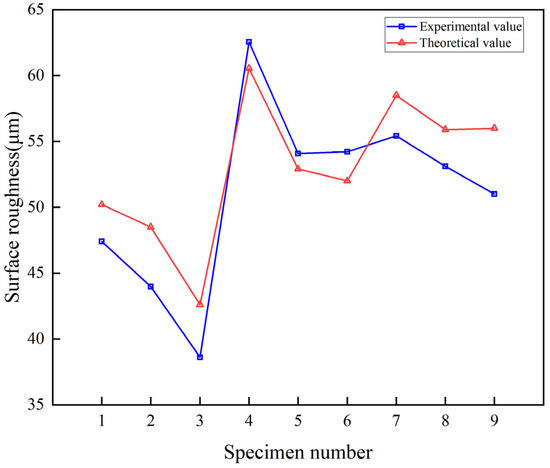 This equation indicates that surface roughness exhibits a positive correlation with jet pressure, where roughness increases with rising pressure. However, the single-factor experiments revealed a nonlinear trend: while roughness initially increases and then decreases with pressure elevation, it remains higher at pressures above 150 MPa compared to the 130 MPa treated specimens. Conversely, standoff distance and nozzle traverse speed show negative correlations with roughness, where larger parameter values reduce roughness—a finding consistent with the conclusions derived from range analysis. Theoretical predictions from the linear regression model were compared against the orthogonal experimental results using numerical computation software, as graphically validated in Figure 7.