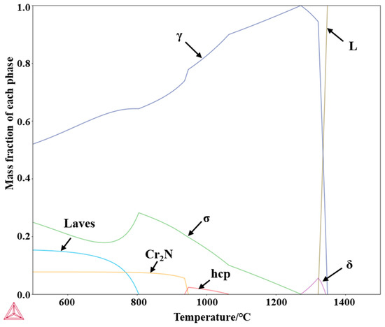 The microstructure and properties of SASS undergo significant changes due to phase transformations and precipitation behaviors during solidification, and phase diagrams are important tools for analyzing the equilibrium phase transformations of materials. This study obtained the curve of stable phase fractions in the SASS matrix alloy as a function of temperature through thermodynamic calculations, as shown in Figure 1. The matrix microstructure is primarily austenite, with the main precipitated phases including the σ phase, Cr2N phase, Laves phase, and hcp phase. At temperatures above 1348 °C, the system consists solely of the liquid phase. When the temperature drops below 1348 °C, the γ phase begins to precipitate, and its fraction rapidly increases with further cooling. Upon further cooling to 1341 °C, a eutectic reaction occurs, L → γ + δ, and the δ phase starts to precipitate. Subsequently, the δ phase gradually transforms into the γ phase and completely disappears below 1276 °C. As the temperature continues to decrease, the γ phase transforms into the σ phase, which becomes the primary precipitated phase in SASS. At 1000 °C, the mass fraction of the σ phase reaches 15.8 wt.%.