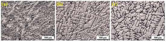 The microstructure of austenitic stainless steels mainly depends on the compositional balance between austenite-stabilizing and ferrite-stabilizing elements, especially the contents of Ni and Cr. These elements influence the solidification process of the alloy to a certain extent. The effect of alloying elements on the microstructure of austenitic stainless steel is commonly described by the equivalents of nickel (Nieq) and chromium (Creq), which are used to establish different solidification modes [21]. According to the classical Creq/Nieq formula, the SASS used in this study has a Creq of 35.1, a Nieq of 34.1, and a Creq/Nieq ratio of 1.03 [22]. Based on this, the SASS exhibits an A-type solidification mode, where austenite forms first from the liquid phase: L → (γ + L) → γ, resulting in a fully austenitic solidified microstructure. It should be noted that the solidification mode of austenitic stainless steels is influenced not only by alloy composition but also by processing parameters such as temperature gradient, cooling rate, and solid–liquid interface growth rate.