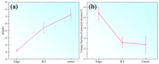 (a) Secondary dendrite spacing at different locations of the ingot; (b) statistical results of eutectoid volume fraction.