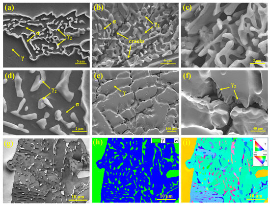 (a) Honeycomb-like eutectic structure; (b) crack passing through the eutectic structure; (c) coral-like γ2 phase; (d) lamellar γ2 phase; (e,f) deep corrosion morphologies of SASS; (g) BC map; (h) phase composition map; (i) IPF map.