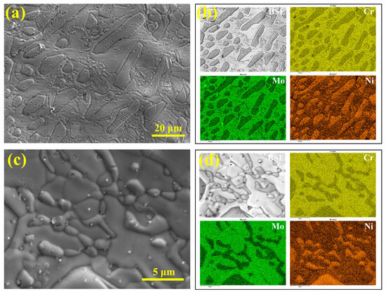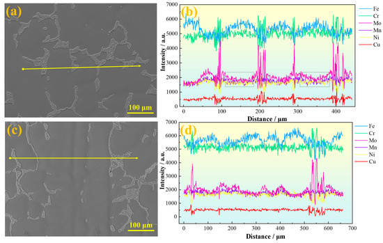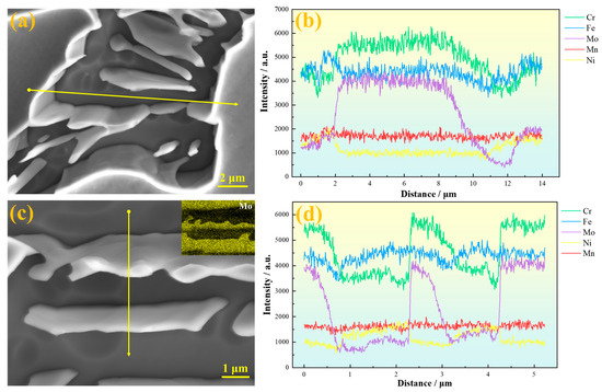 Figure 5c,d show line scan results perpendicular to the dendrite trunk direction. It can be seen that Mo exhibits obvious positive segregation in the interdendritic regions. Slight Mo enrichment is also observed in the austenite regions at the center of secondary dendrites, although eutectoid structures have not yet formed there. The greater the amplitude of Mo content fluctuation, the easier it is for eutectoid structures to be induced in the interdendritic areas. Since SASS inherently contains a high Mo content, and Mo tends to segregate in interdendritic regions, combined with the relatively low diffusion rates of other alloying elements in austenite, this further aggravates Mo segregation and ultimately promotes the precipitation of brittle σ phase [26].