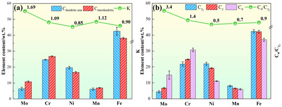represents the average elemental concentration in the interdendritic region, while denotes the average concentration in the dendrite arms, which is used to quantify the degree of microsegregation in the solidified structure. Twenty regions each were selected in the interdendritic and dendrite cores for compositional analysis to reduce experimental error. The measurement results are shown in Figure 7a. The results indicate that the degree of elemental segregation follows the order: Mo > Ni > Mn > Fe > Cr. Among them, Mo exhibits the most severe segregation with a segregation ratio of 1.69. Besides Mo, Ni also shows significant segregation behavior, with a segregation ratio of 0.85, indicating notable Ni enrichment during solidification.