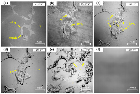 In situ observation of the S32654Y melting process: (a) second-phase particles are distributed on the matrix; (b) the σ phase between dendrites begins to dissolve; (c) the γ2 phase gradually starts to dissolve; (d) the γ2 phase is completely dissolved; (e) the austenitic matrix dissolves rapidly; (f) the sample is completely melted.