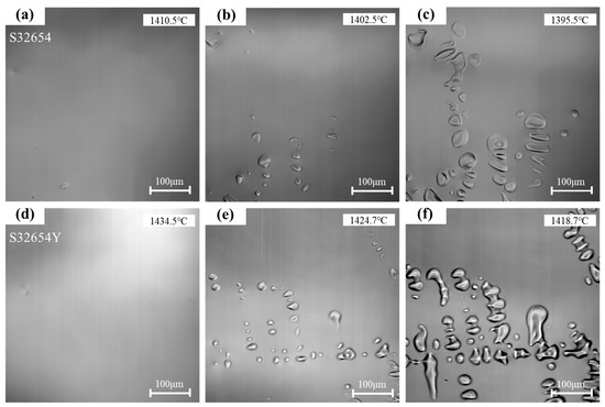 In contrast, the S32654Y sample exhibited significant differences during solidification. As shown in Figure 9d–f, initial solidification of this sample began at 1435.5 °C (Figure 9d), with a nucleation temperature notably higher than that of the sample without rare earth additions. This indicates that microalloying with the rare earth element Y promotes the formation of the austenite phase. Studies have shown that rare earth elements can form fine inclusions at the early stages of solidification, providing nucleation sites that effectively enhance the heterogeneous nucleation of the austenite phase. Previous research [12] points out that inclusions formed by rare earth elements typically possess good lattice matching, which is one of the key factors promoting austenite nucleation.