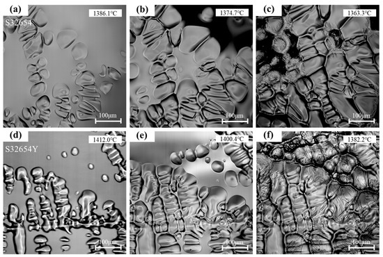 In situ observation of SASS solidification process S32654 (a) beginning of solidification, (b) solidification 12 s, (c) solidification 25 s; S32654Y (d) beginning of solidification, (e) solidification 12 s, (f) solidification 25 s.