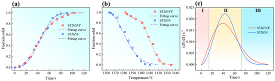 (a) Solid fraction–time fitting curve; (b) solid fraction–temperature fitting curve; (c) solidification speed–time curve. (I—Initial solidification stage; II—Steady-state solidification stage; III—Final solidification stage.)
