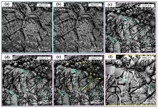 The solid-state phase transformation process of the samples is shown in Figure 12. For the S32654 sample, when cooled to 964.6 °C (Figure 12b), a sudden phase transformation occurs, resulting in the precipitation of a large amount of lamellar structures, primarily distributed between the feather-like structures. In contrast, for the S32654Y sample, as shown in Figure 12c, no phase transformation is observed when the temperature drops to 1135.8 °C. Subsequently, when the temperature decreases to 1123.5 °C (Figure 12d), lamellar structures begin to precipitate, as indicated by the green arrows. Further cooling to 1110.7 °C completes the precipitation of the lamellar structures, and the phase transformation occurs at a very fast rate. Figure 12f is a magnified view of Figure 12e, clearly showing the precipitation of a secondary phase between the feather-like structures, while the feather-like structures themselves remain unchanged. In addition, some of the secondary phase precipitates directly from the austenitic dendrites.