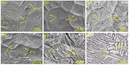 The microstructure of the samples observed using high-temperature in situ confocal microscopy is shown in Figure 13. For the S32654 sample, a large number of dendritic structures can be seen on the surface, with the dendrites slightly protruding above the surface. Their morphology corresponds to the feather-like structures shown in Figure 12 (Figure 13a). Lamellar structures are distributed between the dendrites, appearing as depressions. As shown in Figure 13b, the solidification microstructure of the S32654Y sample is finer and exhibits typical eutectoid characteristics, primarily distributed between the feather-like and granular structures. The particles within the eutectoid structure are γ2 phase. Figure 13c is the corresponding backscattered electron (BSE) image of Figure 13b, revealing two distinct contrast regions: the brighter areas represent the σ phase, while the darker areas correspond to the austenite phase. Figure 13d,e clearly show the morphological features of the austenitic dendrites and the interdendritic σ phase. Figure 13f presents the microstructure of the S32654Y sample after metallographic preparation, showing a morphology highly consistent with the in situ microstructure observed in the lower left region of Figure 13c, both consisting of austenitic dendrites and interdendritic eutectoid structures.