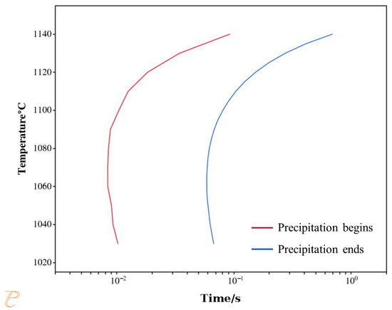 The kinetics of phase transformation play a crucial role in controlling the microstructure and properties of materials. The time required for isothermal transformations can be characterized using a Time–Temperature–Transformation (TTT) diagram. Figure 15 presents the TTT curve for the precipitation of the σ phase from austenite. The red curve represents the onset time of σ phase precipitation, while the blue curve corresponds to the completion time of the precipitation reaction. As shown in the figure, the σ phase precipitates at a very fast rate—even a short residence time within the calculated temperature range can lead to its rapid formation. This result is consistent with the aforementioned in situ observations. Therefore, relying solely on rapid cooling is insufficient to effectively suppress σ phase precipitation. Additionally, the “nose temperature” for σ phase precipitation is 1070 °C, at which the precipitation rate reaches its maximum.