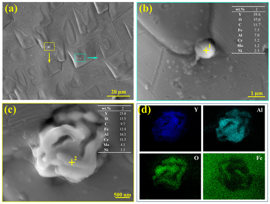 (a–c) SEM morphologies and EDS point analysis results of rare earth inclusions in the S32654Y sample; (d) EDS elemental mapping of the rare earth inclusions.