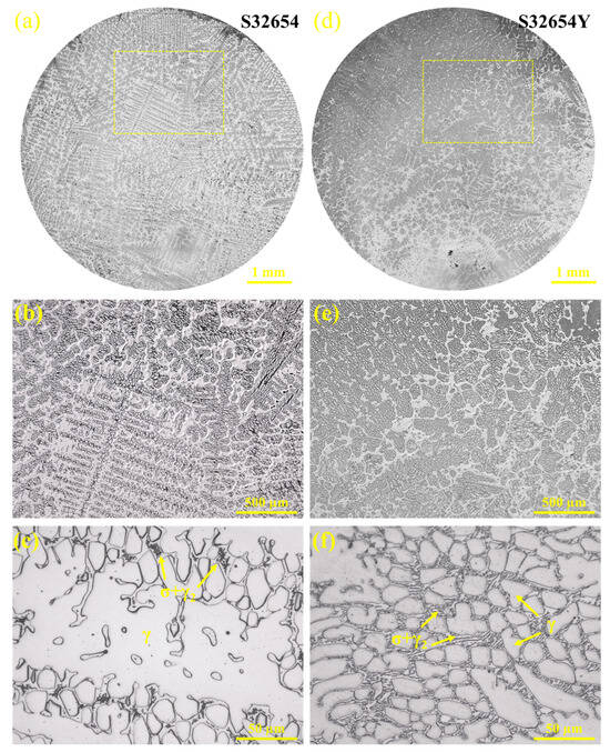 Metallographic morphology of HT-CLSM samples: (a–c) S32654; (d–f) S32654Y.