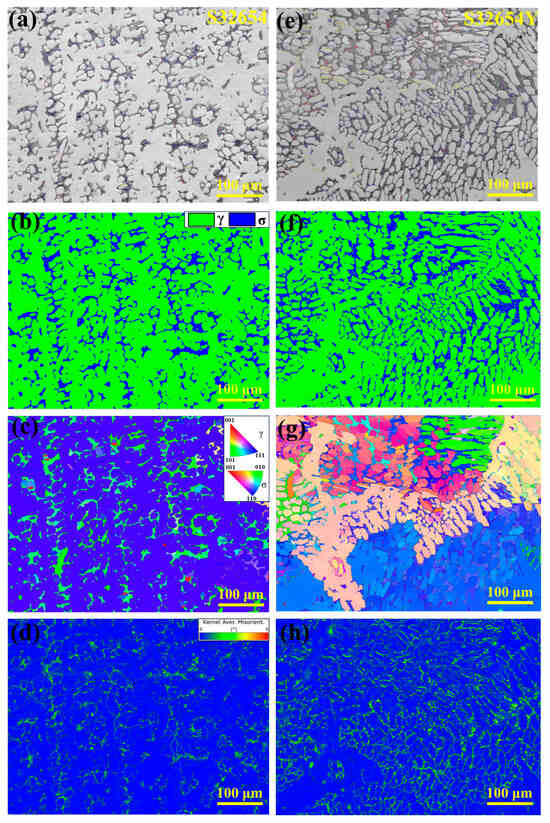 EBSD analysis results of S32654 sample: (a) IQ map, (b) phase composition map, (c) phase composition map, (d) KAM map; EBSD analysis results of S32654Y sample: (e) IQ map; (f) phase composition map; (g) phase composition map; (h) KAM map.