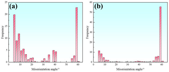 Statistical distribution of misorientation angles in austenite: (a) S32654; (b) S32654Y.