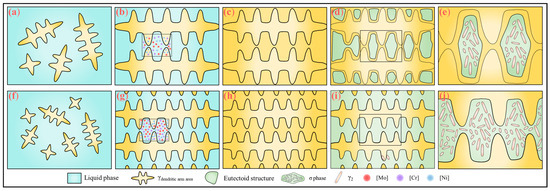 Figure 21 illustrates a schematic diagram of the mechanism by which the rare earth element Y affects the solidification microstructure and σ phase precipitation behavior in SASS. In the early stage of solidification (Figure 21a,f), rare earth inclusions act as heterogeneous nucleation sites, facilitating the nucleation of austenite and raising the nucleation starting temperature. With the introduction of rare earth Y (Figure 21b,g), the alloy’s solidification temperature range is broadened, and the grain growth time is extended, which intensifies the segregation of Cr and Mo elements in the interdendritic regions. At the end of solidification (Figure 21c,h), the microstructure transforms into fully austenitic. During the subsequent eutectic transformation stage (Figure 21d,i), the addition of rare earth elements raises the eutectic transformation temperature and promotes the precipitation of the σ phase. Meanwhile, rare earth inclusions may also serve as heterogeneous nucleation sites for the σ phase, leading to an increase in σ phase content. Additionally, due to dendrite refinement, the growth space for the σ phase is limited, resulting in a smaller σ phase size. In summary, through the synergistic effect of rare earth inclusions and solute Y, the solidification microstructure of the sample is refined, but the σ phase content increases (Figure 21e,j).