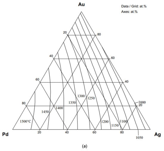 - Prince, A.; Gröbner, J.; Rao, M.V.; Kuznetsov, V. Landolt-Börnstein Book Series: Numerical Data and Functional Relationships in Science and Technology—New Series IV/11B, Ternary Alloy Systems-Silver–Gold–Palladium Phase Diagrams, Crystallographic and Thermodynamic Data; Effenberg, G., Ilyenko, S., Eds.; Springer Nature BV: Dordrecht, The Netherlands, 2006; Volume IV/11B: Noble Metal Systems, pp. 50–54. [Google Scholar]