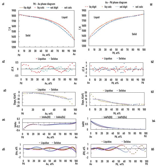 As shown in the theoretical part (Equations (15) and (23)), the ESTPHAD method has a hierarchical structure, using the functions of two-component equilibrium phase diagrams to calculate the liquidus and solidus surfaces of three-component equilibrium phase diagrams. To perform the calculations, the phase diagrams of both BEPDs (Figure 1) [] and the TEPDs (Figure 2) [] were only available graphically, so the data were determined through digitalisation. In the case of BEPDs, the concentration of the liquidus and solidus was determined at every 1 at% between the melting points of the two elements. The Ag and Au concentration data of the liquidus and solidus isotherms of the TEPDs were determined step by step, changing the Pd concentration by ~1 at%. The isotherms were included in the diagrams in 50 K steps.