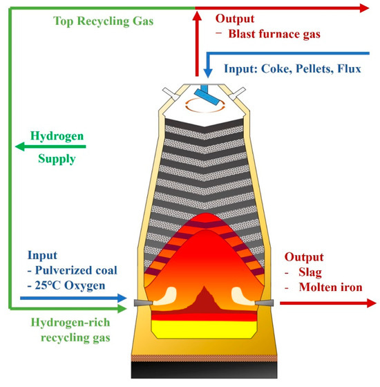 - Zhang, W.; Zhang, J.; Xue, Z. Exergy Analyses of the Oxygen Blast Furnace with Top Gas Recycling Process. Energy 2017, 121, 135–146. [Google Scholar] [CrossRef]