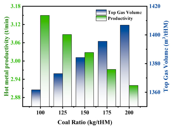Pulverized coal injection (PCI) technology is now a well-established and effective method for controlling the thermal regime of the blast furnace. Considering the practical operational parameters, the pulverized coal rate was set in the range of 100–200 kg/tHM. The recycled gas volume was fixed at 750 m3/tHM, based on the operating parameters of the OBF in China. To maintain furnace balance, the coke ratio was adjusted accordingly. The effect of coal ratio on productivity and top gas volume in the OBF is illustrated in Figure 2.