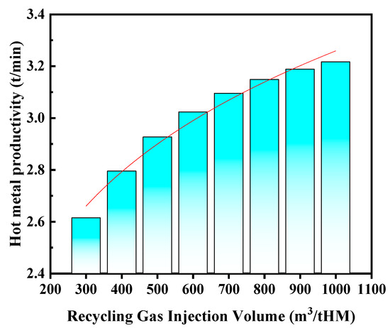 Based on the production data from the OBF in China [30], the range of recycling gas volume is set to 300–1000 m3/tHM in this model. The relationship between the injected recycling gas volume and OBF productivity is shown in Figure 3.
