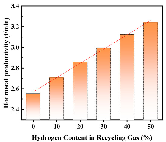Hydrogen-rich smelting also offers numerous advantages, such as reducing carbon consumption, lowering carbon emissions, and improving indirect reduction efficiency. However, the industrial application of hydrogen-rich technology in the blast furnace smelting of VTM still faces many pressing challenges. Therefore, the research and development of hydrogen-rich technology are of great practical significance for OBF smelting of VTM. In this model, the recycling gas volume is fixed at 750 m3/t, and the coal ratio is set at 110 kg/t. The relationship between OBF productivity and the H2 content in the recycling gas after calculating the blast furnace productivity under different H2 contents is shown in Figure 4.