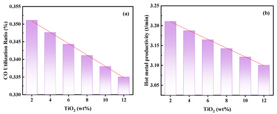 The results are shown in Figure 5. It can be seen that both CO utilization and blast furnace productivity decrease with the increase in the titanium content of the composite charge. The primary reason for the decrease in CO utilization is that, as the titanium content in the composite charge increases (from 2–12 wt%, with an interval of 2%), more iron oxides combine with titanium oxides in the form of solid solutions, increasing the difficulty of reducing iron oxides and thereby reducing the utilization of CO.