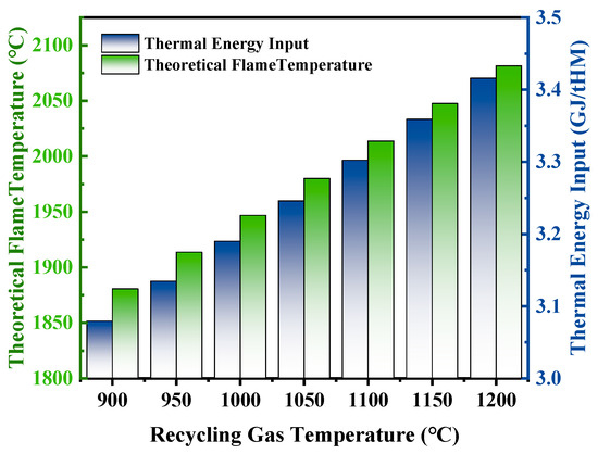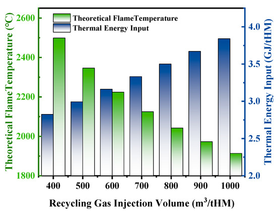 As shown in Figure 6, the theoretical flame temperature decreases significantly with the increase in recycling gas volume, and the rate of decrease gradually diminishes. Meanwhile, the heat in the high-temperature zone correspondingly increases. Specifically, for every 100 m3/tHM increase in recycling gas volume, the heat in the hearth zone increases by 0.17 GJ. When the recycling gas volume reaches 400 m3/t, the heat in the hearth zone is 2.82 GJ, with a theoretical flame temperature of 2498.52 °C. When the recycling gas volume increases to 1000 m3/t, the heat in the hearth zone further rises to 3.84 GJ, while the theoretical flame temperature drops to 1912.86 °C.