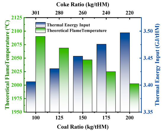 3.2.3. Effect of Pulverized Coal Ratio and Coke Ratio on Theoretical Flame Temperature and Heat Distribution