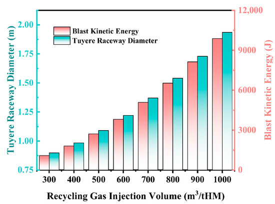 As shown in Figure 9, both the blast kinetic energy and the structure of the tuyere raceway zone increase significantly with the increase in recycling gas volume, and the trends of these two parameters are highly consistent. When the recycling gas volume increases from 300 m3/tHM to 1000 m3/tHM, the blast kinetic energy rises from 1086.74 J to 9875.38 J, and the diameter of the tuyere raceway zone increases from 0.9 m to 1.94 m. This phenomenon occurs primarily because blast kinetic energy is determined by factors such as gas density and the square of the blast velocity. The increase in recycling gas volume significantly increases the total gas flow rate. Under the condition of a fixed tuyere cross-sectional area, the blast velocity increases accordingly, and the kinetic energy grows quadratically with the velocity. Meanwhile, the enhanced momentum carried by the high-velocity gas drives the coke layer at the front of the tuyere towards the central region, promoting its combustion and thereby expanding the diameter of the raceway zone. Therefore, with the increase in recycling gas volume, both blast kinetic energy and the size of the tuyere raceway zone increase significantly.