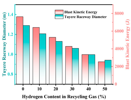 Figure 10 illustrates the impact of hydrogen content in recycling gas on blast kinetic energy and the structure of the tuyere raceway zone. As shown in Figure 10, both blast kinetic energy and the diameter of the tuyere raceway zone decrease significantly with an increase in the hydrogen content of the recycling gas. This phenomenon is closely related to changes in gas density and momentum. The molecular weight of hydrogen (2 g/mol) is significantly lower than that of carbon monoxide (28 g/mol). According to the formula for blast kinetic energy, when the proportion of hydrogen increases, the average density ρ of the recycling gas decreases. The increase in the explosion velocity v is not sufficient to compensate for the effects brought about by the reduction in density, resulting in a significant reduction in total kinetic energy. The insufficient kinetic energy weakens the penetration ability of gas through the coke layer, making it difficult to form a strong recirculating gas flow and causing the diameter of the raceway zone (the coke fluidization area in front of the tuyere) to shrink. Although the low viscosity of hydrogen may slightly increase the flow velocity, the momentum reduction dominated by its density is still the key factor.