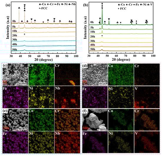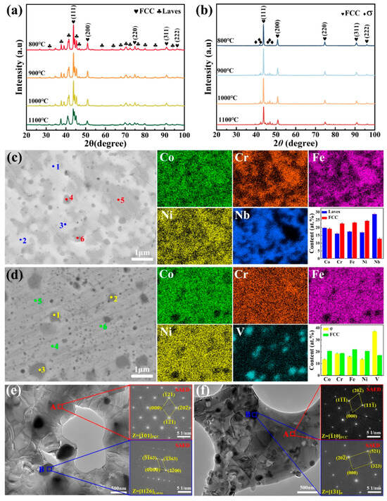 Figure 2a,b show the XRD patterns of sintered CoCrFeNiNb and CoCrFeNiV HEAs at different temperatures, indicating that alloying elements significantly has a substantial impact on the phase composition and stability of the HEAs. In