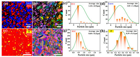 Figure 3c,d, which provide the grain size statistics for the FCC and Laves phases, showing average grain sizes of 1.81 ± 1.18 µm for the FCC phase and 1.10 ± 0.93 µm for the Laves phase, respectively. The finer and more uniform distribution of Laves grains suggests its role as a strengthening phase within the FCC matrix, contributing to enhanced mechanical properties.