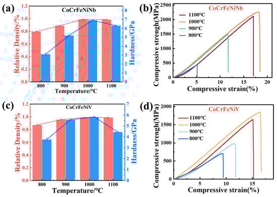 Figure 4a,c, the hardness and relative density exhibit a tendency to initially increase with rising temperature, reaching a maximum at 1000 °C, followed by a decline at 1100 °C. At 800 °C, the CoCrFeNiNb HEA exhibits a hardness of approximately 3.08 GPa and a relative density of 79.6%, while the CoCrFeNiV HEA achieves higher values of 3.76 GPa and 87.1%, respectively. At this temperature, the incomplete solidification of the alloy powders gives rise to the formation of alloy blocks with relatively low density and hardness. As the sintering temperature is increased to 1000 °C, the CoCrFeNiNb HEA achieves a hardness of approximately 6.89 GPa and a relative density nearing 99.0%. Similarly, the CoCrFeNiV HEA reaches a hardness of about 5.86 GPa and a relative density of 99.1%. This improvement in hardness and densification can be attributed to the accelerated solid-state diffusion and sintering kinetics at this temperature, which promote the formation of fully densified alloy blocks with minimized porosity. However, further increasing the sintering temperature to 1100 °C results in a noticeable decline in both properties for both HEAs. This decline is primarily caused by the volatilization of elements with low melting points and highly volatility, as well as the introduction of impurities during high-temperature sintering. Moreover, the process of grain coarsening, occurring as a consequence of prolonged exposure to high-temperature conditions, leads to the generation of residual porosity. This, in turn, has a detrimental effect on the density and hardness of the alloys [