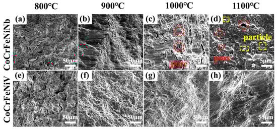 Figure 5c,g. While residual pores remain visible, their distribution and size vary due to differences in magnification and material composition. The fracture surfaces predominantly exhibit brittle characteristics, with flat regions and layered structures indicative of a transgranular fracture mechanism. As the temperature is increased to 1100 °C, distinct granular precipitates (highlighted as “particles” in