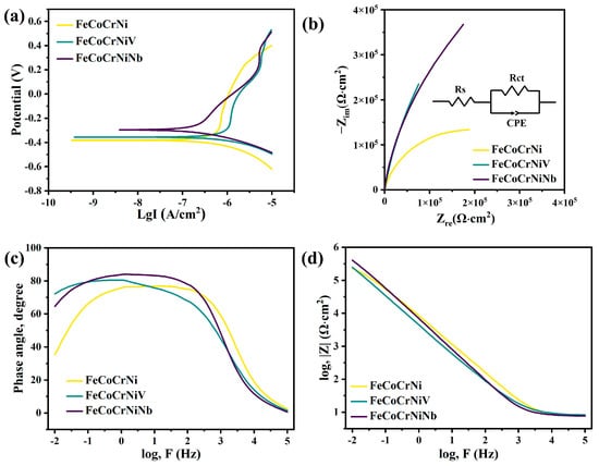 Figure 6b–d illustrates the potentiodynamic polarization curves, equivalent electrical circuit, Nyquist plots, and Bode plots for CoCrFeNi, CoCrFeNiNb, and CoCrFeNiV high-entropy alloys (HEAs) in a 3.5 wt.% NaCl solution under their respective open-circuit potential (OCP) conditions. The equivalent electrical circuit used to fit the EIS data is shown in the upper right corner of