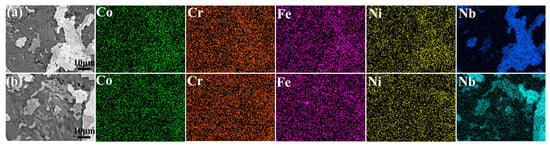 Figure 2c,d show the EDS elemental mapping and the corresponding SEM images of sintered CoCrFeNiNb and CoCrFeNiV HEAs at 1100 °C with a holding time of 15 min. In
