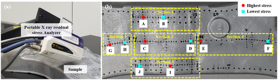 Figure 1. (a) Portable X-ray residual stress analyzer; (b) residual stress measurement zones and locations.