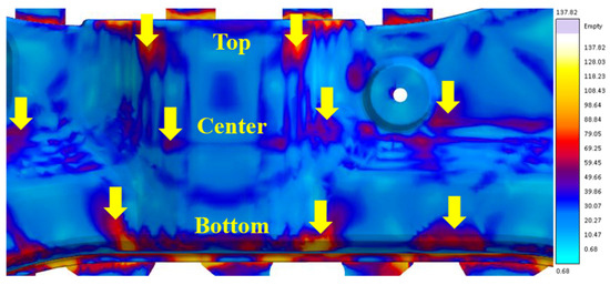 A residual stress prediction simulation was conducted using MAGMA software (version 6.1) under conditions similar to the actual process. As shown in Figure 2, residual stresses were concentrated at the top and bottom areas, while high residual stresses were observed only in certain regions at the center. Based on these results, the measurement zones of the actual cast product were divided into five areas, and the surface residual stresses of each zone were measured. Subsequently, microstructural factors that were expected to influence residual stress were selected, and their correlations were evaluated using statistical methods.