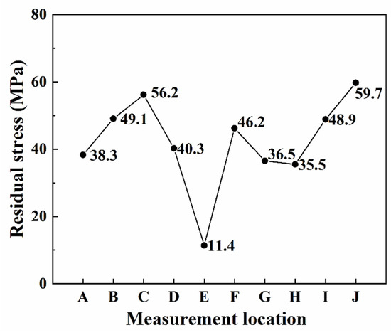Based on the simulation, the residual stress measurement zones and locations were selected, with the highest residual stress of 59.7 MPa observed at location J and the lowest residual stress of 11.4 MPa observed at location E.