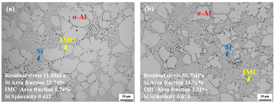 Based on the residual stress prediction simulation presented in Figure 2, the locations with the highest residual stress (A, C, E, G, I) and the lowest residual stress (B, D, F, H, J) were selected within five zones where stress concentration was expected, as shown in Figure 1. In order to minimize the influence of macroscopic structure on the residual stress and analyze the influence of microstructure alone, the residual stress after polishing was measured, and the results are shown in Figure 3. After polishing the surface, the highest residual stress was observed at location J, with a value of 59.7 MPa, while the lowest residual stress was found at location E, with a value of 11.4 MPa. Additionally, locations G and H exhibited similar levels of residual stress, at 36.5 MPa and 35.5 MPa, respectively. As shown in Figure 4, a comparison of the microstructural characteristics between the locations with the highest (J) and lowest (E) residual stress revealed that location J exhibited a higher Si area fraction, IMC area fraction, and Si sphericity than location E. These microstructural differences suggest that they may have contributed to the development of localized residual stresses. The distribution of residual stress appeared uneven depending on the measurement location, and this is presumed to be due to microstructural inhomogeneity, measurement error, and differences in surface condition, even though the same polishing conditions were applied.
