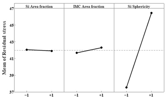 After eliminating all interaction effects among the factors, a statistical analysis considering only the main effects was performed, and the results are presented in Figure 5 and Table 5. An analysis of the primary factors—Si area fraction, intermetallic compound (IMC) area fraction, and Si sphericity—revealed that Si sphericity, which exhibited the steepest slope, had the greatest influence on residual stress, whereas the Si area fraction had the least effect. Among the three major factors, Si sphericity, with a p-value of 0.046, was identified as the most statistically significant factor.
