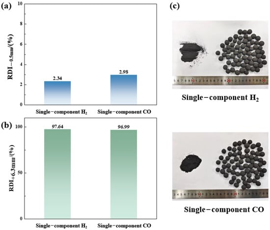 (a) Reduction disintegration index (RDI−0.5 mm), (b) reduction disintegration index (RDI+6.3 mm) and (c) disintegration morphology of vanadium–titanium pellets under single-component H2 or CO atmosphere. (reduction temperature, 500 °C; reduction time, 60 min).