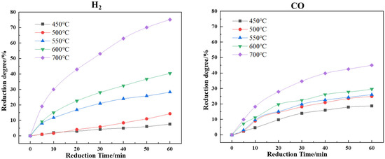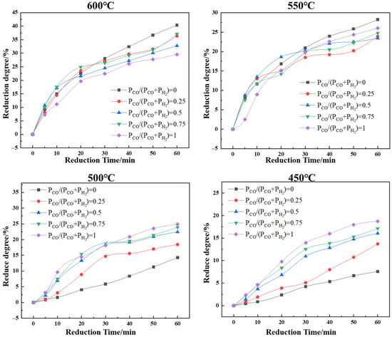 In the temperature range of 450 °C to 700 °C, the reduction behavior of vanadium–titanium magnetite pellets in a mixed H2–CO atmosphere was investigated, as shown in Figure 6. During the initial 20–30 min, the reduction degree increased rapidly. However, after 30 min, the reduction rate began to decrease. Additionally, due to the different reduction ability of H2 and CO, uneven volume expansion occurred in various regions of the pellets, resulting in internal stress accumulation that promoted structural disintegration. At 600 °C, the reduction capacity of H2 exceeded that of the mixed H2–CO atmosphere, while the mixed atmosphere was more effective than CO alone. At 550 °C, H2 and CO exhibited nearly equivalent reduction performance. Below 500 °C, the reduction capacity of H2 declined significantly, and an increased H2 proportion in the mixture led to a slower rise in reduction degree. The observed difference in reduction rates between H2 and CO under low-temperature conditions might be a key factor contributing to pellet disintegration. Therefore, further investigation into the reduction kinetics of H2 and CO at low temperatures was essential for elucidating this process.