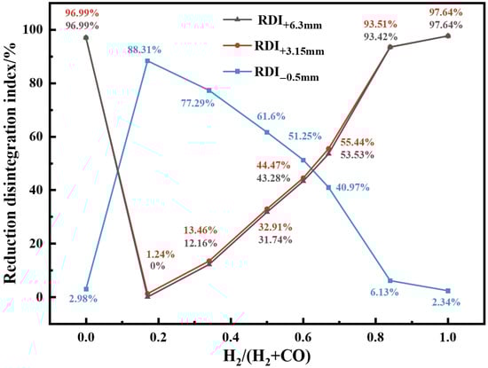 - In the single-component H2 or CO atmosphere, vanadium–titanium magnetite pellets demonstrated favorable reduction disintegration behavior. However, as φ(H2) increased from 0 to 0.17, the reduction disintegration behavior declined markedly, with the RDI+6.3 mm fraction dropping sharply from 96.99% to 0%. Further increases in H2 concentration led to an improvement in disintegration behavior.