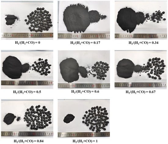 The effects of CO and H2 on the reduction disintegration behavior of vanadium–titanium magnetite pellets were investigated using a dynamic rotary tube at a reduction temperature of 500 °C for 60 min, with results presented in Figure 2. In both single H2 and CO atmospheres, the pellets exhibited favorable low-temperature reduction disintegration performance, with RDI+6.3 mm values of 97.64% and 96.99%, respectively.