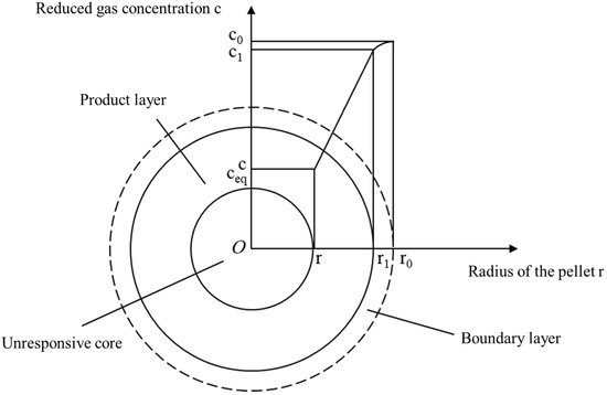 Rate control was determined by the slowest of these steps, typically either interfacial reaction or internal gas diffusion; steps 4 and 5 had negligible kinetic impact. Given the complex pore structure of vanadium–titanium pellets, a single-interface shrinking-core formulation was chosen to capture the gradual inward advance of the reaction front (Figure 7) and to support subsequent kinetic analyses [17,18].