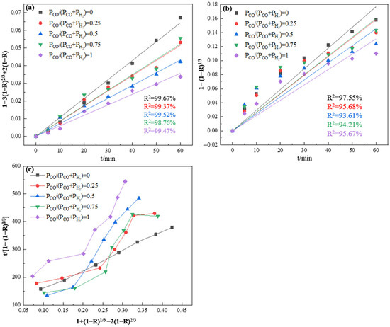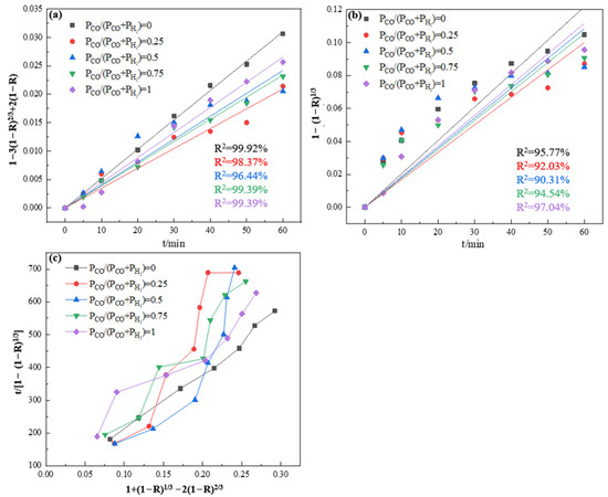 In the temperature range of 450 °C to 600 °C, the rate-controlling factor for the reduction in vanadium–titanium magnetite pellets was found to vary with the reduction temperature, and the kinetic mechanisms of H2, CO, and H2–CO mixtures in the reduction process remained unclear. To ascertain the controlling link of the reduction reaction of vanadium–titanium magnetite pellets at different reduction temperatures, plots were generated using the reduction degree data alongside the three rate-control Equations (8)–(10). Specifically, the relationship curve of 1 − 3(1 − R)2/3 + 2(1 − R) and time t, 1 − (1 − R)1/3 and time t, as well as t/[1 − (1 − R)1/3] and 1 − 3(1 − R)2/3 + 2(1 − R) was plotted. The data points in these plots were then fitted linearly, and the coefficients of determination for the fitted straight lines were obtained. The closer the coefficients of determination were to 100%, the better the agreement between the experimental data and the fitted straight line was indicated.