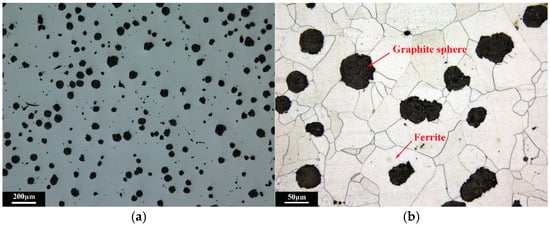An inductively coupled plasma atomic emission spectrometer (ICP-AES, Shimadzu ICPE-9810, Shimadzu, Colombia, MD, USA) was used to determine the precise chemical compositions, and the results are shown in Table 1. The experimental NCI was spheroidized with mixed rare earth elements, and the rare earth composition was not listed. To achieve full ferritization, the as-cast material underwent controlled annealing. The specific process is as follows: heating to 920 °C for 2 h, followed by furnace cooling to 720 °C for 4 h, and then air cooling to room temperature after furnace cooling to 600 °C. Metallographic preparation involved sequential grinding (SiC 240~2000 grit), diamond polishing, and 4% nital etching for 15–20 s. The microstructure of the NCI is shown in Figure 1. Referring to ISO 945-4 [22], the proportion of graphite is 10.11%, with an average spheroidization rate of 87%. The graphite sizes cover size 6 (30–60 μm) and size 7 (15–30 μm).