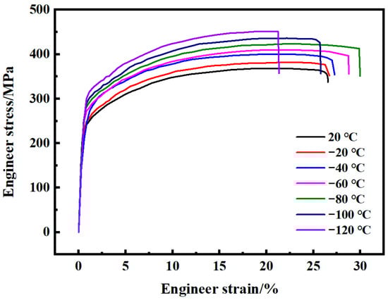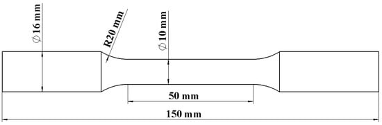 The shape and size of the tensile specimen are shown in Figure 2, with a 150 mm total length, 50 mm gauge length, and 10 mm nominal diameter. Uniaxial tensile tests were performed using a W + B LFV-100 kN universal testing system. The testing temperature covered from room temperature to −120 °C (−20 °C, −40 °C, −60 °C, −80 °C, −100 °C, and −120 °C). Each specimen underwent 10 min of thermal stabilization after reaching the experimental temperature. The displacement-controlled loading was applied through a constant crosshead velocity of 0.75 mm/min, corresponding to the strain rate of 2.5 × 10−4/s.